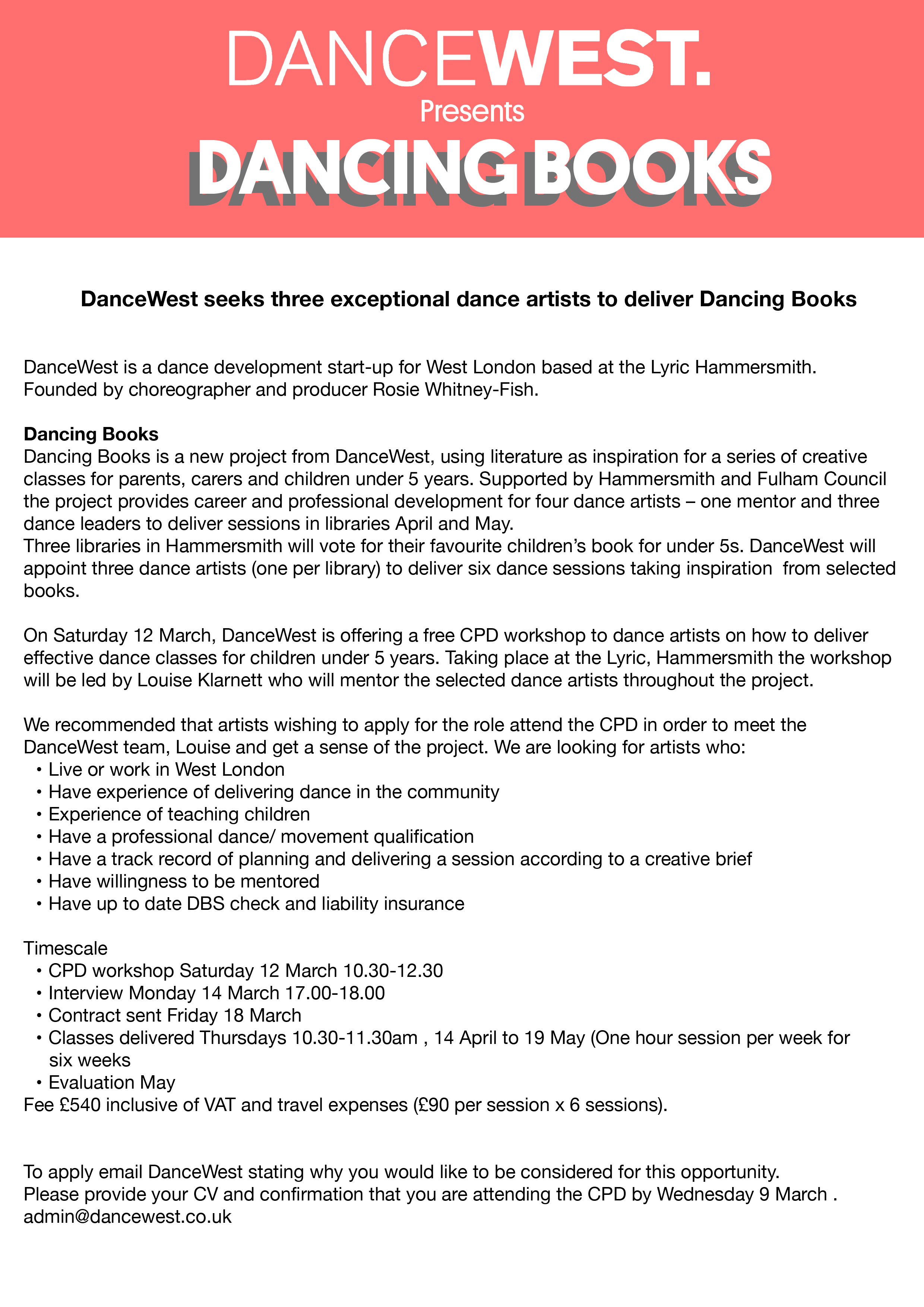 DanceWest March 2, 2016 Dancing Books - We need you! DanceWest March 2, 2016 We are seeking three exceptional dance artists to deliver Dancing Books, a brand new project which uses literature as inspiration for a series of creative classes for parents, carers and under 5s.