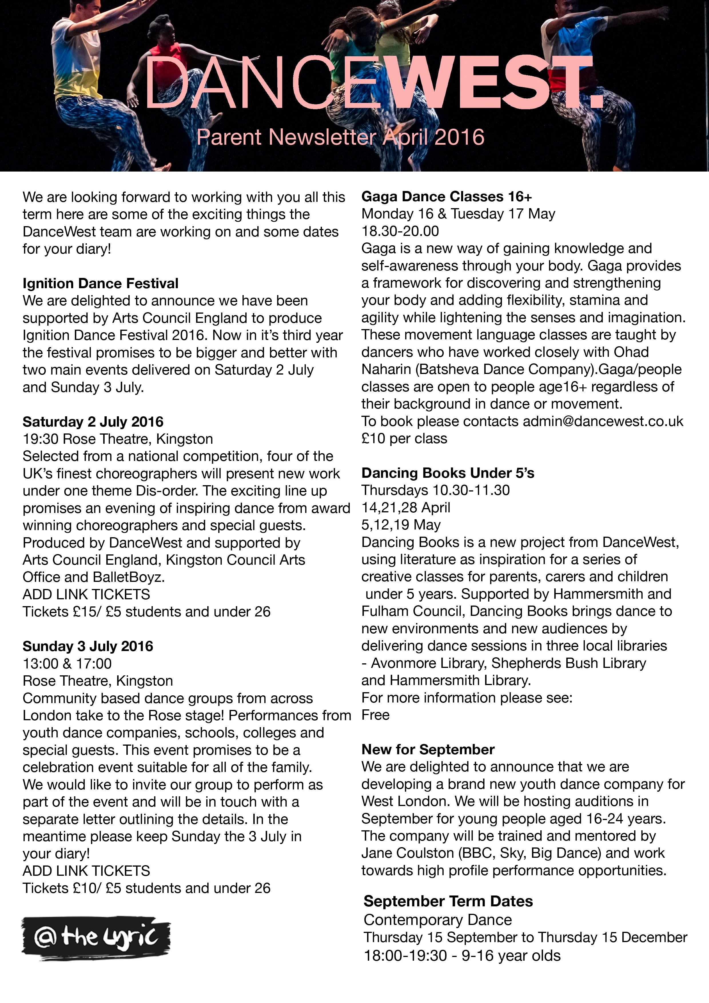 DanceWest April 16, 2016 Parent & Carer Newsletter DanceWest April 16, 2016 News just in for our class attendees!