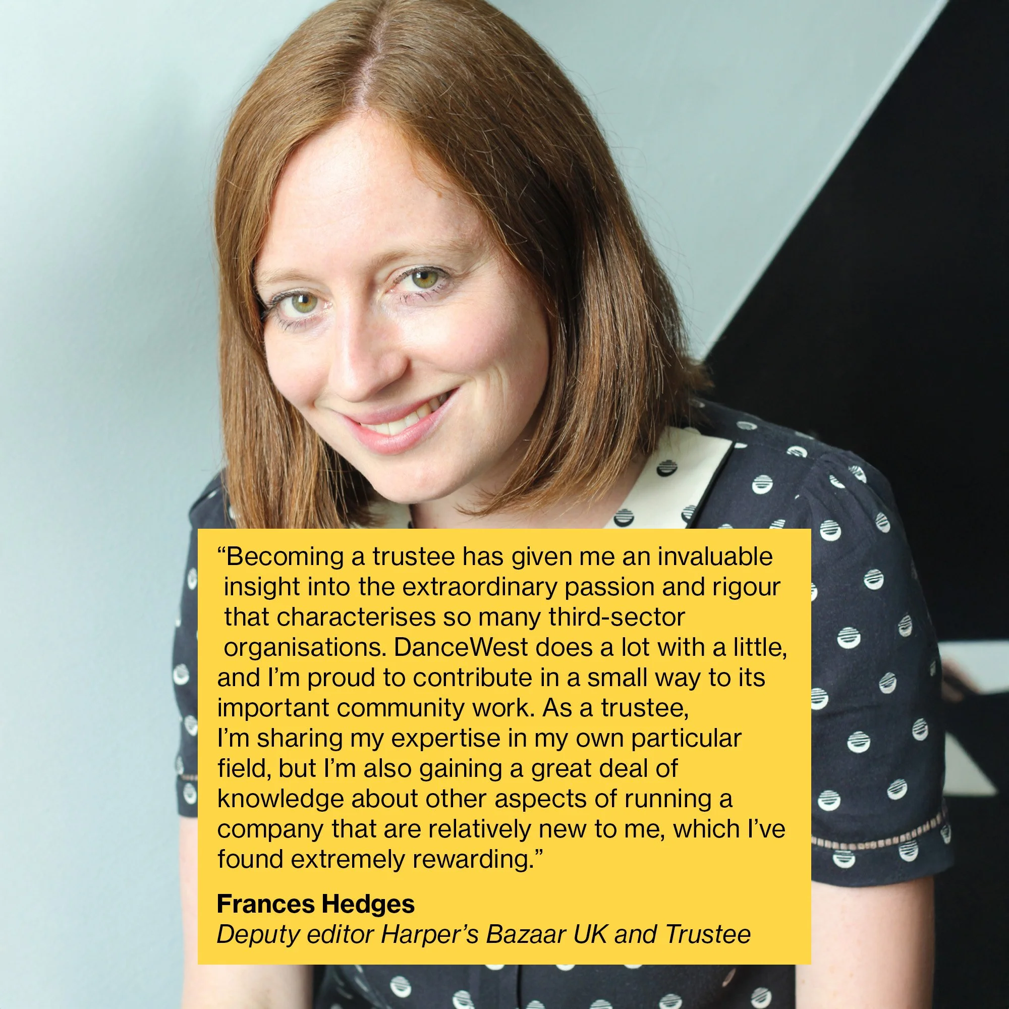 Frances is a journalist and editor with more than 15 years’ experience working in the media. As the deputy editor of Harper’s Bazaar UK, a magazine that has a long history of championing the arts, she has interviewed internationally renowned artists, writers and performers, while seeking to provide a voice and platform for underrepresented talent in the cultural sector.